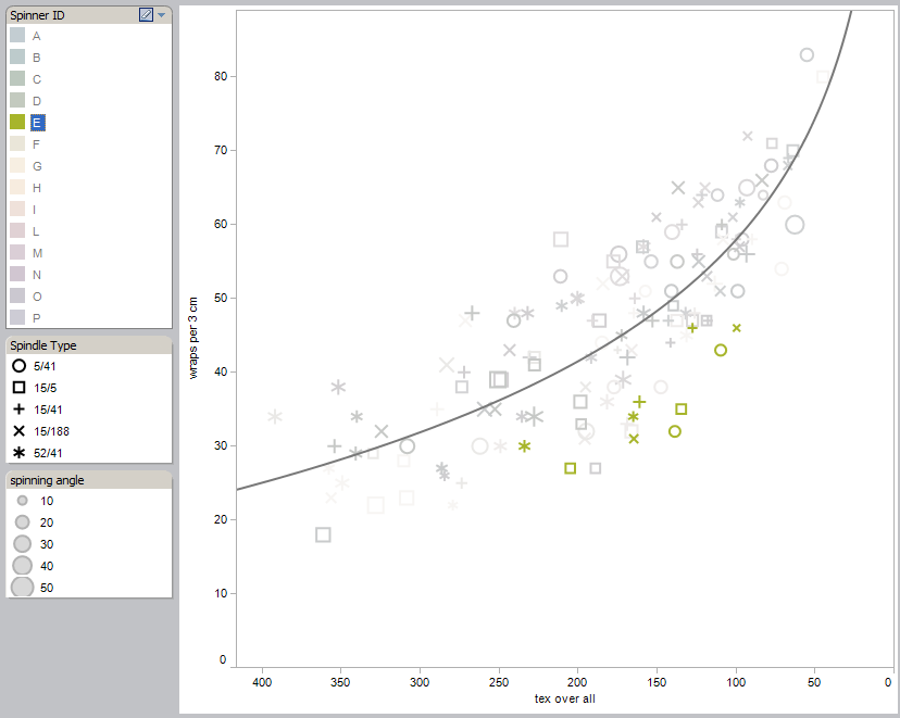 which, in this case, shows the ten thread samples Spinner E spun. E's data points lie in a group underneath the trend line for wraps per 3 cm compared to tex (which compares the weight of thread per metre to its diameter, giving a hint on how tightly spun it is).